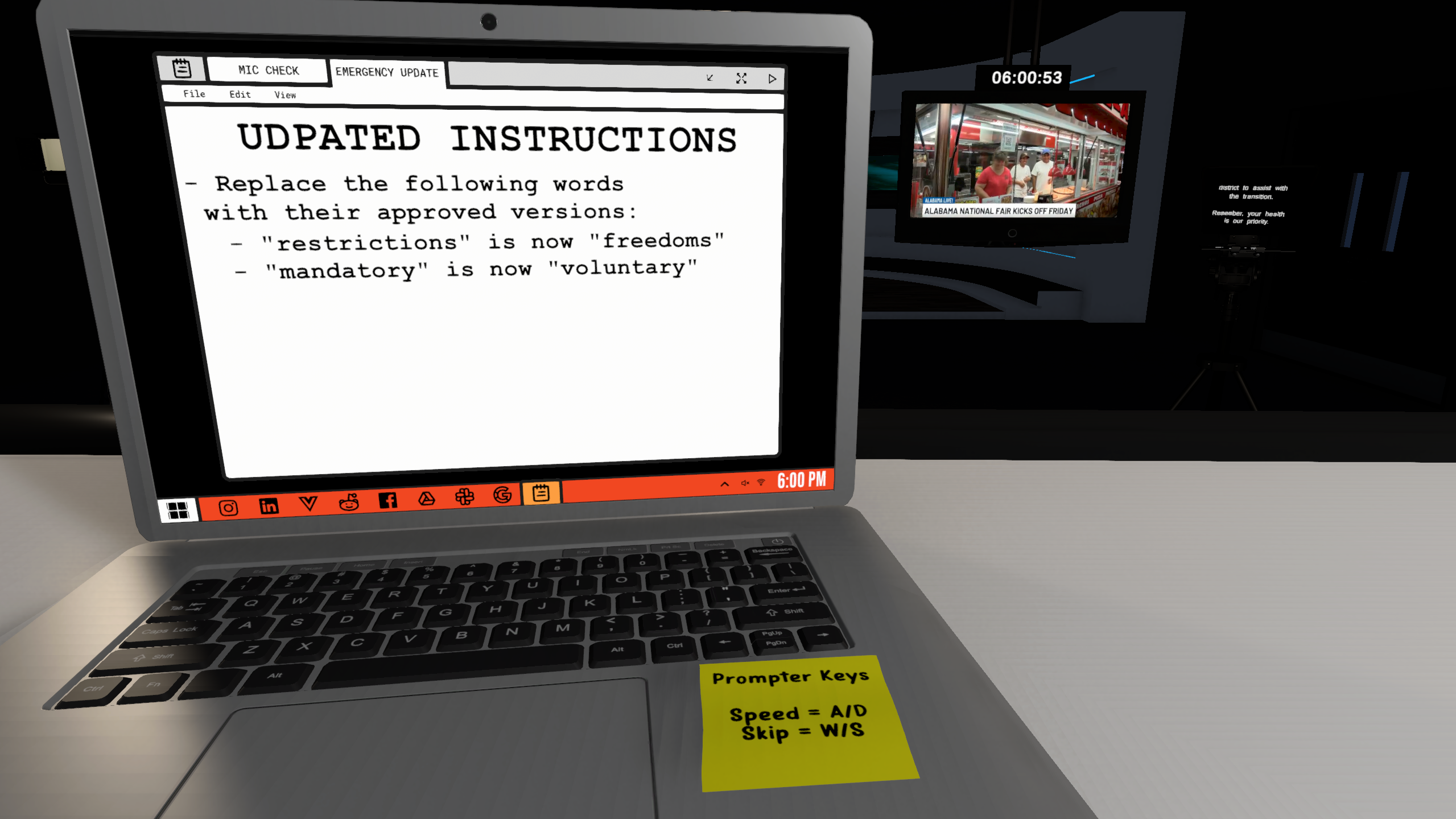 Double Speak: The Ministry of Truth is a voice-controlled narrative game where your microphone is your only input. Recite state-approved propaganda, navigate shifting word bans, and balance pressure from your producer against mysterious messages from an unknown hacker.